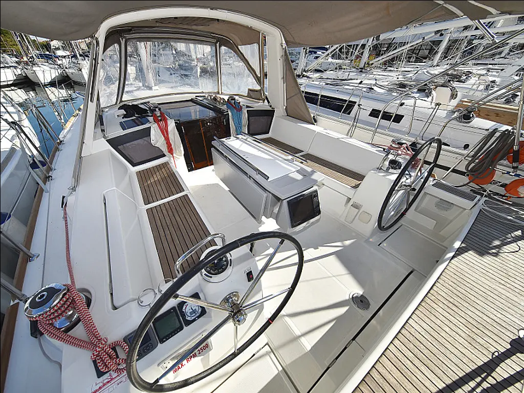 220V connector , Air condition , Anchor type Britany with chain and rope , Autopilot , Barometer , Bathing platform , Battery charger , Bimini top , Binocular , Bosuns chair , Bow thruster , Bucket / Hooper / grass , Convertible table , Dinghy , Distress flare box , Divider, navigation ruler etc. , Electric bilge pump , Electric fans in cabins , Electric refrigerator , Electric toilet (2) , Electric winches (true) , Fenders , Fire extinguishers , First aid kit , Fog horn , Galley , Gas bottle , GPS chart plotter - cockpit , Handbearing compass , Heating , Horsehoe bouy , Hot water , Life jackets , Life raft , Log-speedometer/Echo sounder , Mooring ropes , Navigation maps , Oven , Radar , Radio , Refrigerator (2) , Roll genoa , Roll main sail , Signal rockets , Solar panels , Sprayhood , Stove , Teak in cockpit , Tool box , Torch light , Webasto , Wind indicator , Windlass
