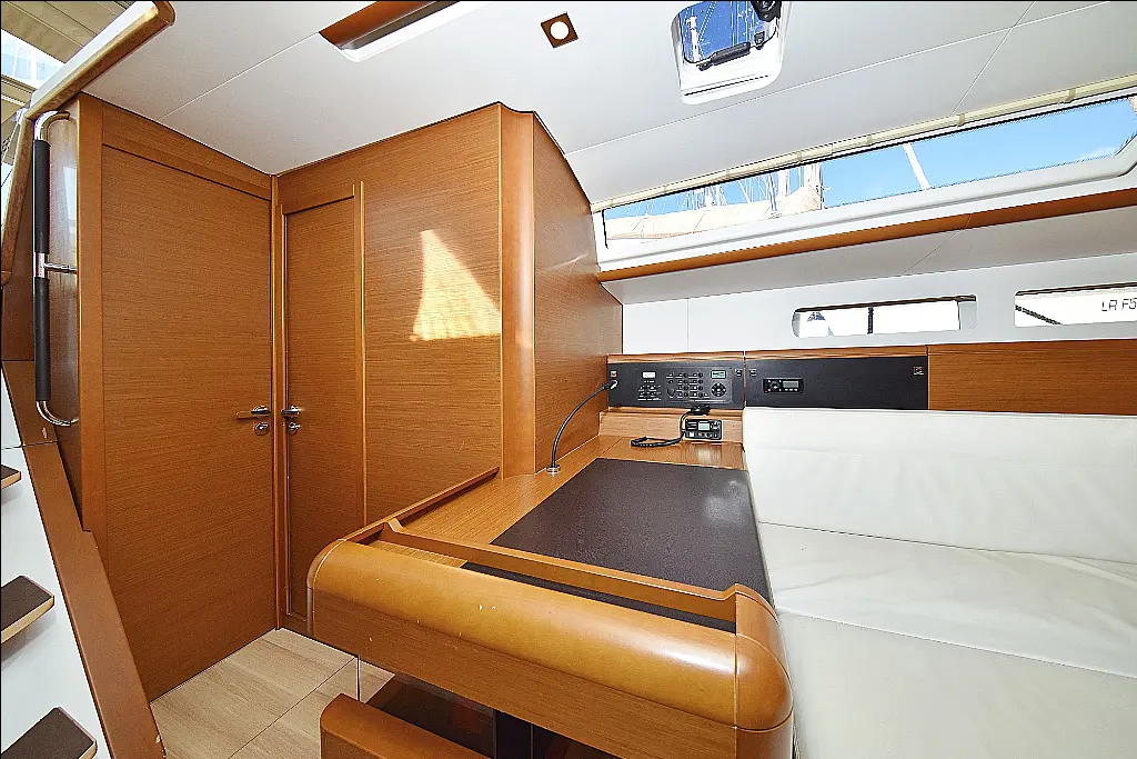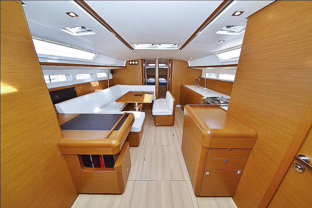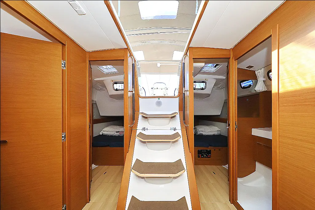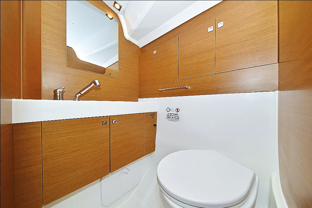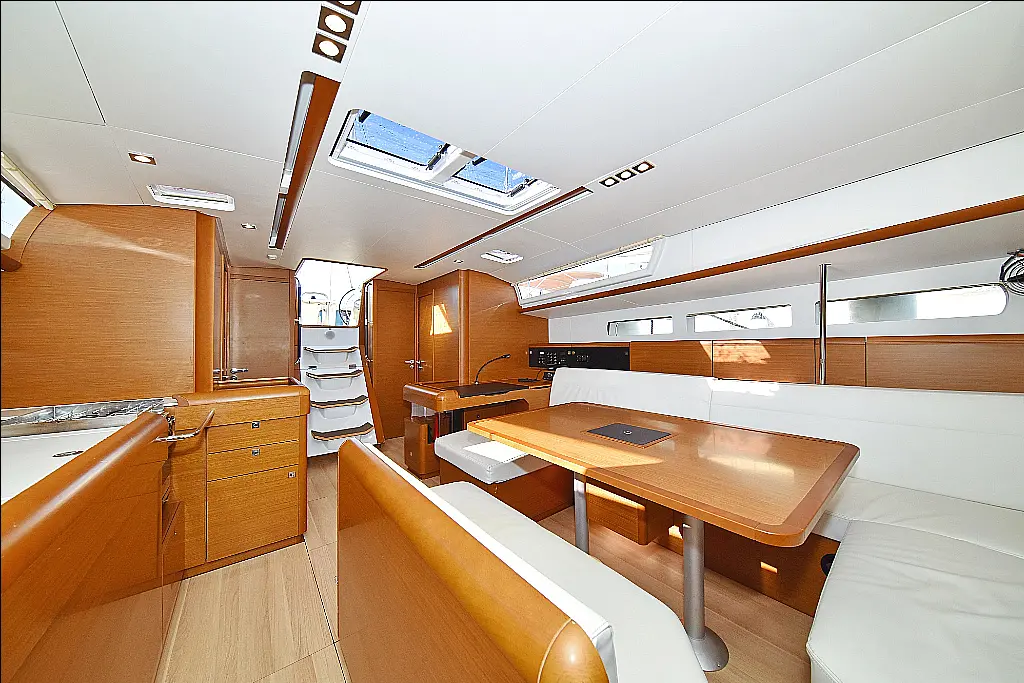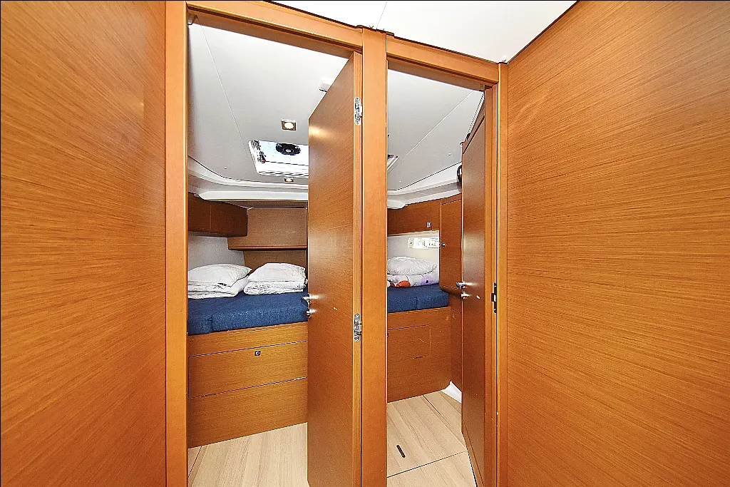 220V shore supply and battery , Aluminum gangway , Autopilot , Bathing platform , Bimini top , Bow thruster , Bunk bed , CD Player , Cockpit cushions , Compass , Convertible table , Deck shower , Dinghy , Electric anchor windlass , Electric refrigerator , Fenders , Fire extinguishers , First aid kit , Flashlight , Garbage bin , Gas bottle , GPS + chart plotter , Holding Tank , Hot water , Kitchen utensils , Log-speedometer/Echo sounder , Nautical charts , Navigation set , Oven , Roll genoa , Roll main sail , Sprayhood , Steering wheel/compass , Tool box , VHF radio , Wind instrument/Anemometer