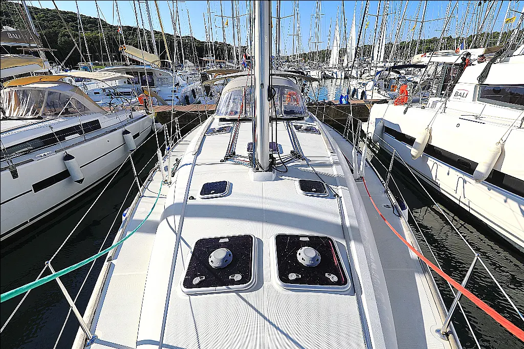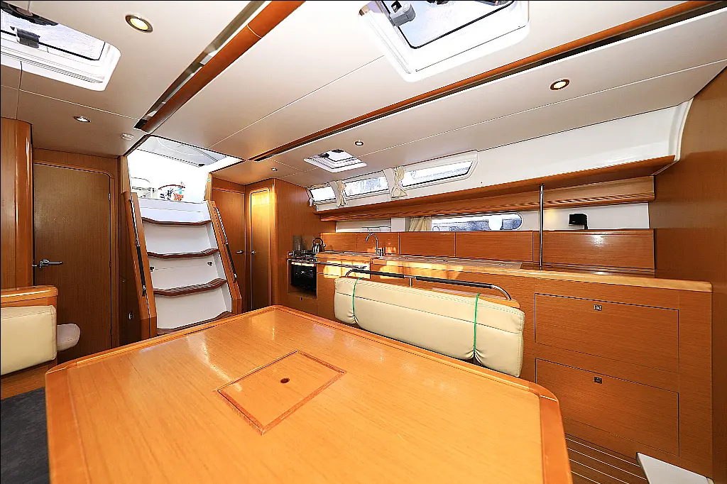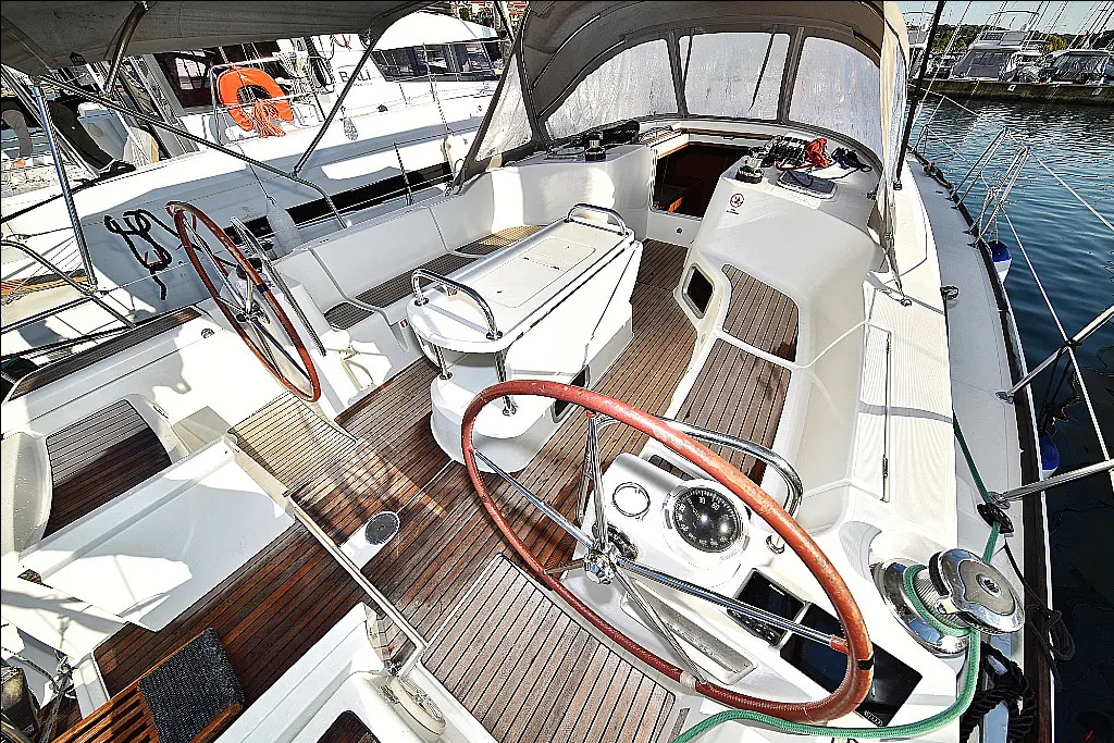 220V shore supply and battery , Aluminum gangway , Autopilot , Bathing platform , Bimini top , CD Player , Cockpit cushions , Compass , Convertible table , Deck shower , Dinghy , Electric anchor windlass , Electric refrigerator , Fire extinguishers , First aid kit , Flashlight , Gas bottle , GPS chart plotter - cockpit , Holding Tank , Hot water , Kitchen utensils , Nautical charts , Navigation set , Oven , Roll genoa , Roll main sail , Sprayhood , Steering wheel/compass , Tool box , VHF radio , Wind instrument/Anemometer