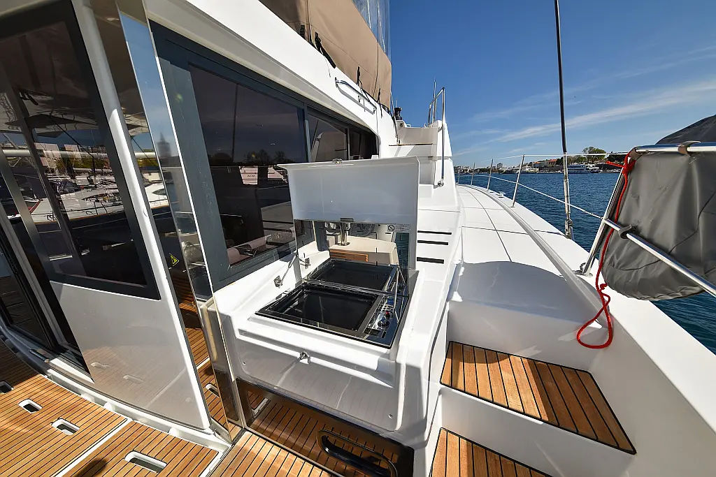 615L combined refrigerator (402L chilled+ 213L freezer) with icemaker and chilled water dispenser , Air condition , Autopilot , Bathing platform , Battery charger , Bed linen , Bimini top , Cockpit cushions , Cockpit table , Cockpit/stern, outside shower , Dinghy , Dishwasher , Electric toilet (4) , Gas cooker , Generator , GPS chart plotter - cockpit , Grill , Heating , Hot water , Ice maker , Inverter , Kitchen utensils , LED lights , Outside speakers , Oven , Radar , Radio , Refrigerator , Solar panels , Stove , Teak in cockpit , Tridata , TV , VHF radio , Watermaker - desalinator , Barbeque grill in cockpit